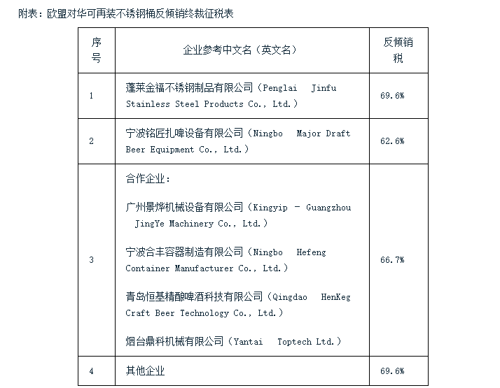 歐盟對華可再裝不銹鋼桶作出反傾銷終裁