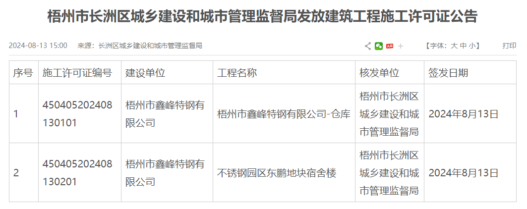 時(shí)間:08/16/2024 08:37:528月13日,梧州市鑫峰特鋼有限公司不銹鋼倉(cāng)庫(kù)及不銹鋼園區(qū)東鵬地塊宿舍樓建設(shè)獲建筑工程施工許可證。